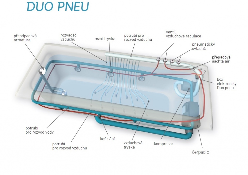 DUO PNEU massage baths consist of two system configurations: hydromassage and air-massage. As the either BASIC or EASY the DUO PNEU systems is furnished with six hydromassage jets. Twelve air-jets which are mounted in two rows on the bottom of a bath. Activation of the hydromassage pump aspirating air is made by means of a pneumatic control. An independent air regulator is mounted on the bath. It enables so that desired massage intensity may be chosen. An identical control with an air regulator has to be installed with the DUO PNEU bath system so it can control the air-massage itself. By means of a blower with air aspiration, and after draining water out of the bath (but no earlier than two minutes before the water is completely drained out of the bath) the air system tubing may be dried out by activating and running the blower idly. A very important notice for the user of this hydro-air-massage pneumatically controlled bath is the fact that this appliance is not furnished with a water-level sensor that monitors water level height. DUO PNEU system can be purchased with whatever acrylic bath of TEiKO company range of products except KLASIK 120 and 150, ALEA, ALEA-S, ASUÁN, MALTA 180 and 190, ISLAND and PIREAS baths. All the components that are part of the DUO PNEU system abound in chrome-plated surface finishing.System specification: